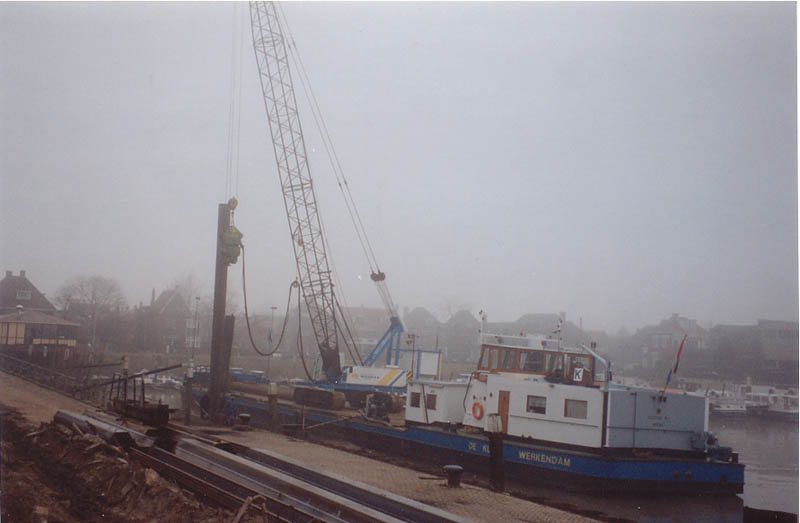 Werk aan de havenkade in de Merwestraat i.v.m. dijkverzwaring.