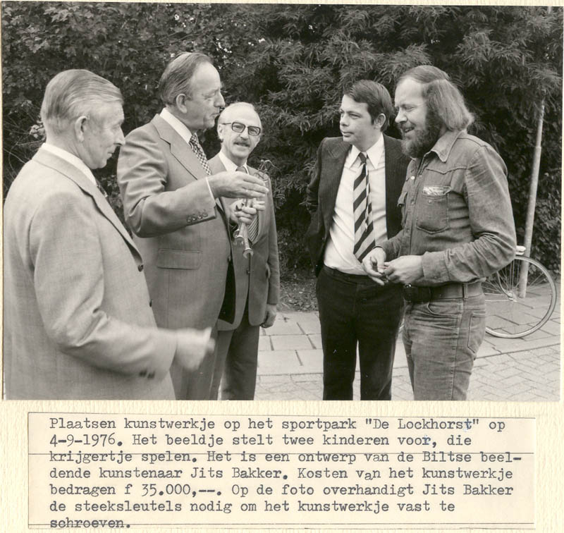 Burgemeester Hendriks, de wethouders De Boon en De Bruijn, ambtenaar Kees van der Stelt en kunstenaar Jits Bakker.