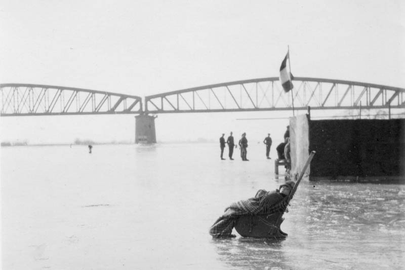 IJs en sneeuw bij de spoorbrug te Baanhoek