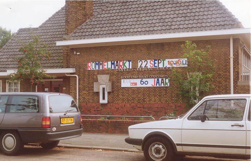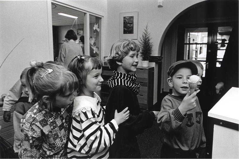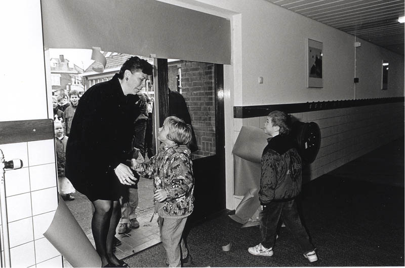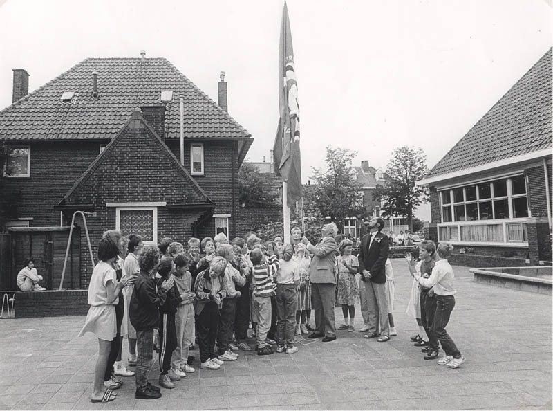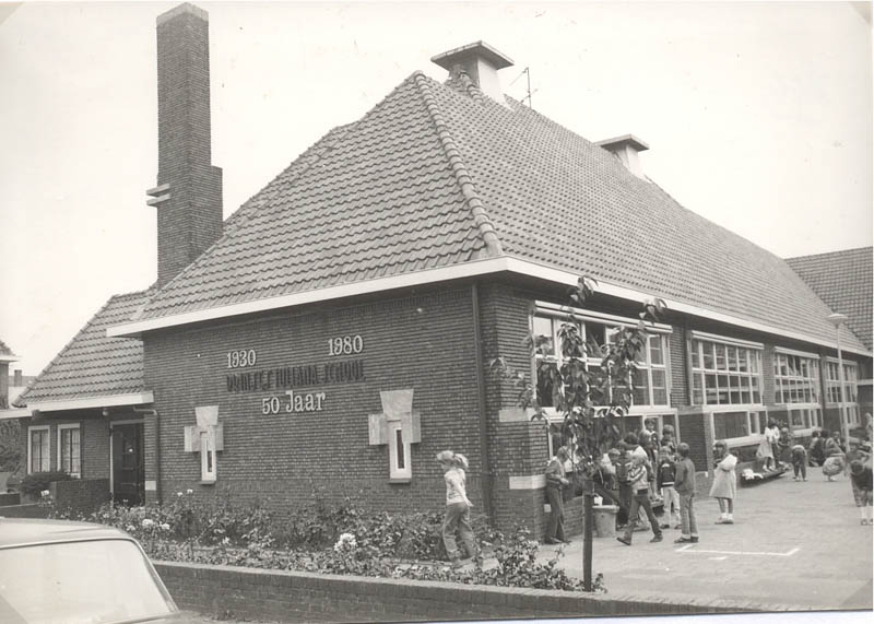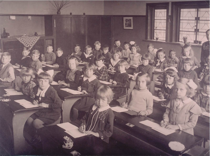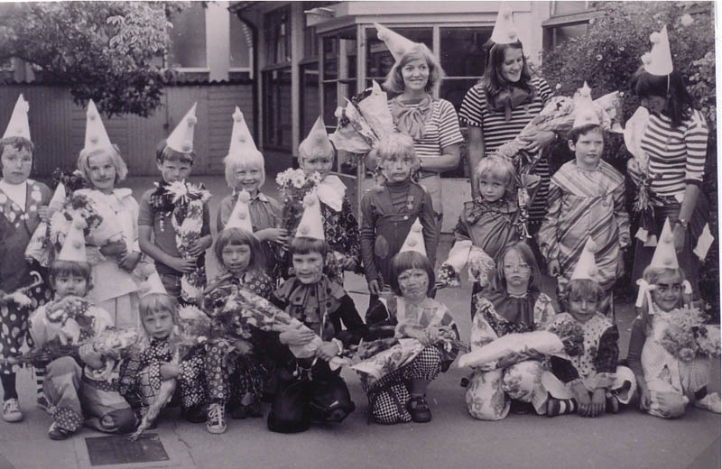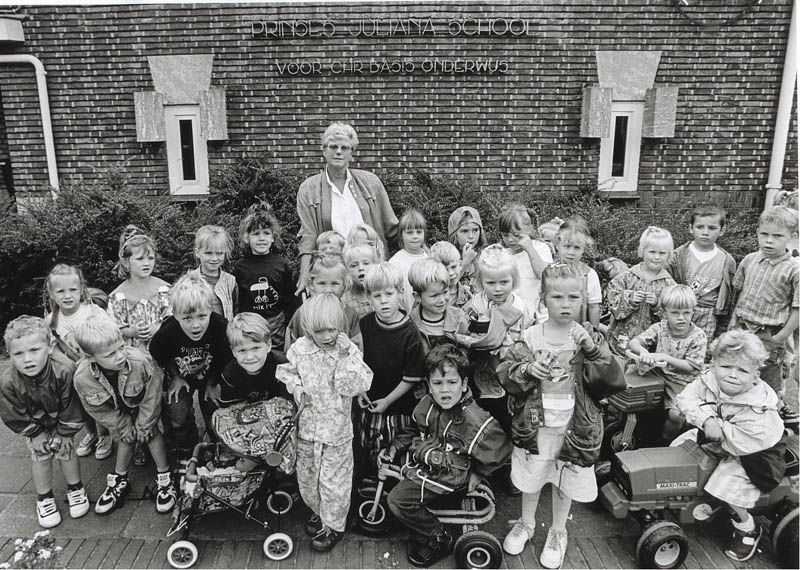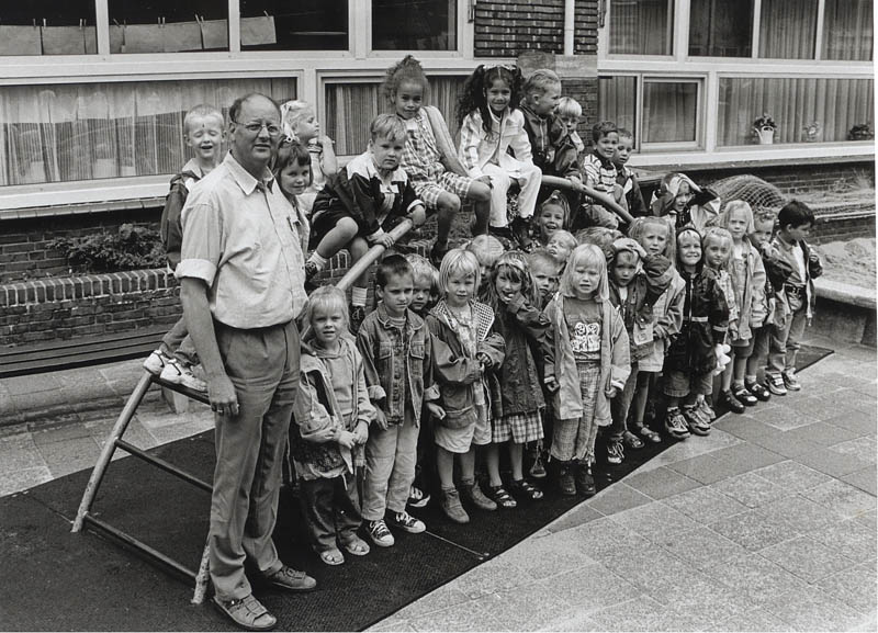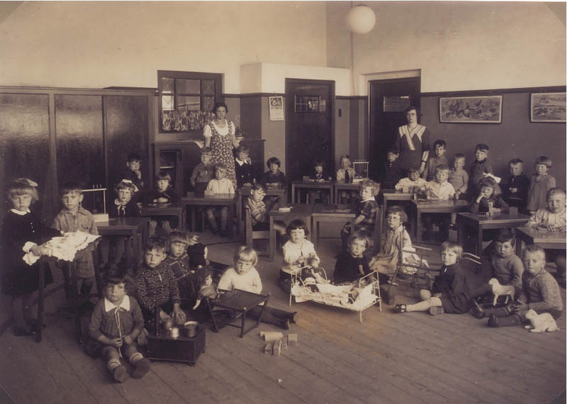 De juffrouw links in het gebloemde jurkje met witte bloes is Janna Bastiaantje (Jenny) van Ballegooijen (1912-1985), dochter van Aalbert van Ballegooijen, voorzitter van het schoolbestuur. Kleuterschool Merwestraat, circa 1936.