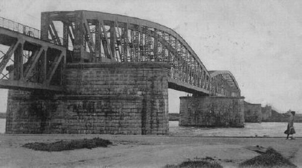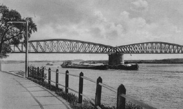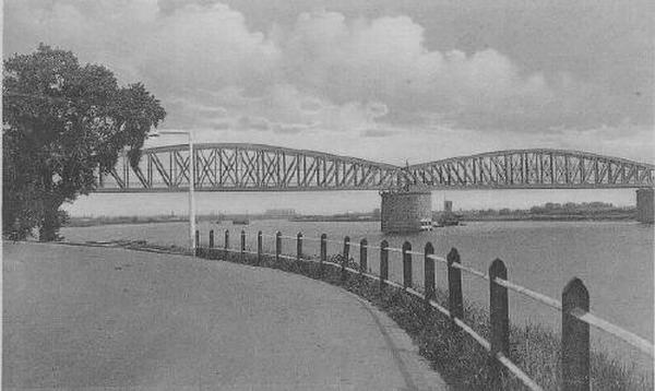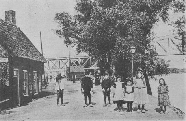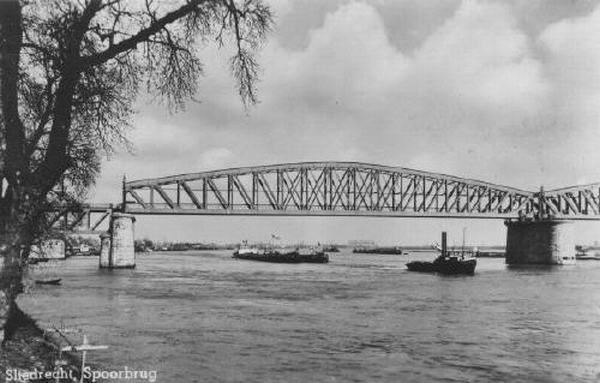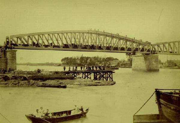 Proefdraaien op de nieuwe spoorbrug. Het is een zeer oude foto van een proefbelasting van de spoorbrug. Deze moet rond 1883 zijn afgenomen ( voor de officiële ingebruikname van de lijn Dordrecht-Geldermalsen.