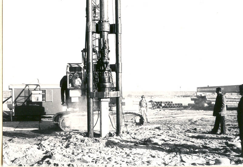 Slaan van 1e paal in de Leeghwaterstraat. Het slaan van de eerste paal van Bakker Repair. Op de achtergrond het pand van Boon Sliedrecht.