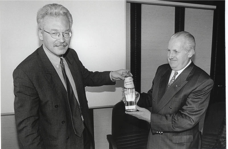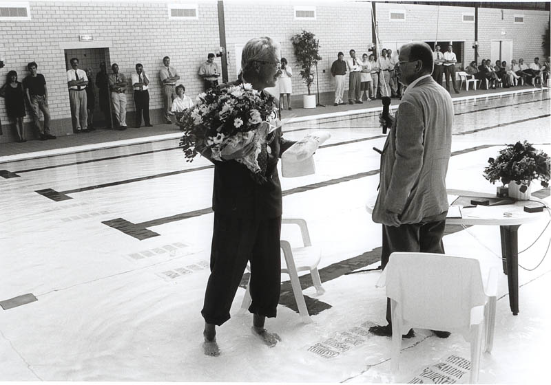 Zwembad Lockhorst.Burgemeester Kleywegt en Arie in 't Veld