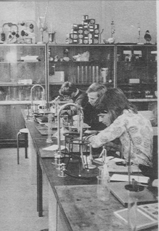 In 1973. Het practicumlokaal van de Erasmusmavo. Van rechts naar links in de klas van de heer Van Ochten. Emiel van Arden naast Bart Van Noordenne, verder Jan Kees Groen en Arie Bakker helemaal links.