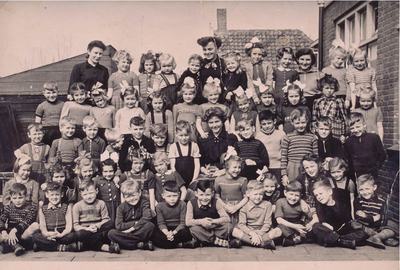1951. Bovenste rij, naast juffrouw Ridders, Truus van den Berg, Lohmeyer. Tweede rij helemaal links Ruud Bakker dan Sjanie Korporaal. Verder Kors de Groot, Henk van den Berg, Kees van den Dool, Mokkie de Winter en Kors Klein.