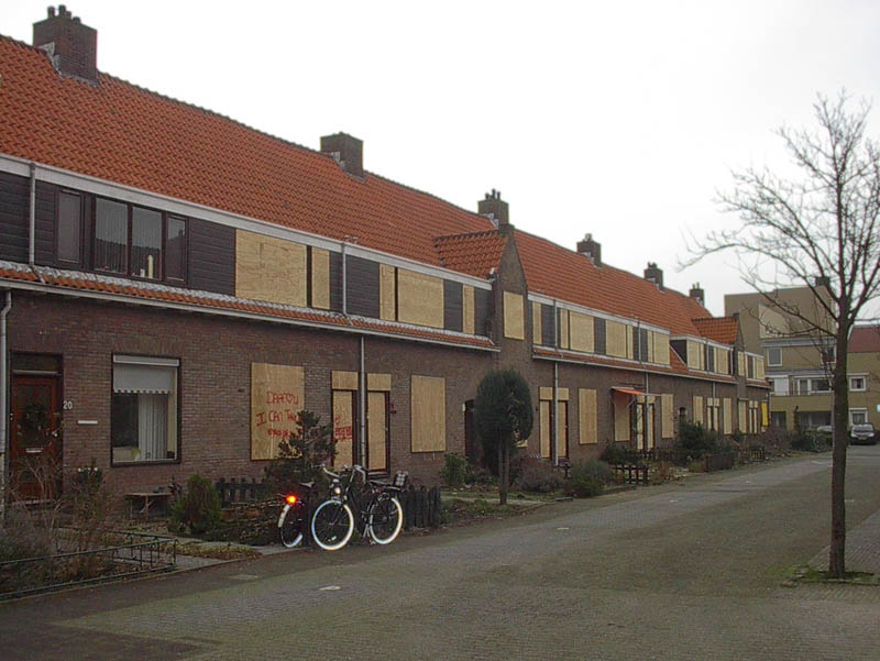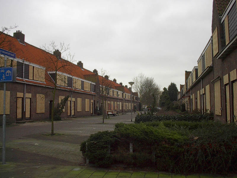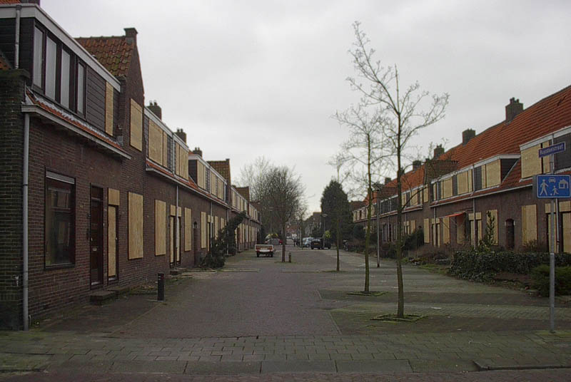 Voor de sloop dichtgespijkerde Ruysdaelstraat