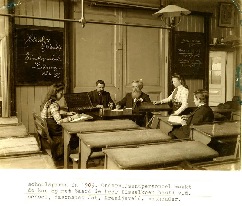 Onderwijzend personeel school 4 tegenover de Grote Kerk maakt de schoolspaarkas op.