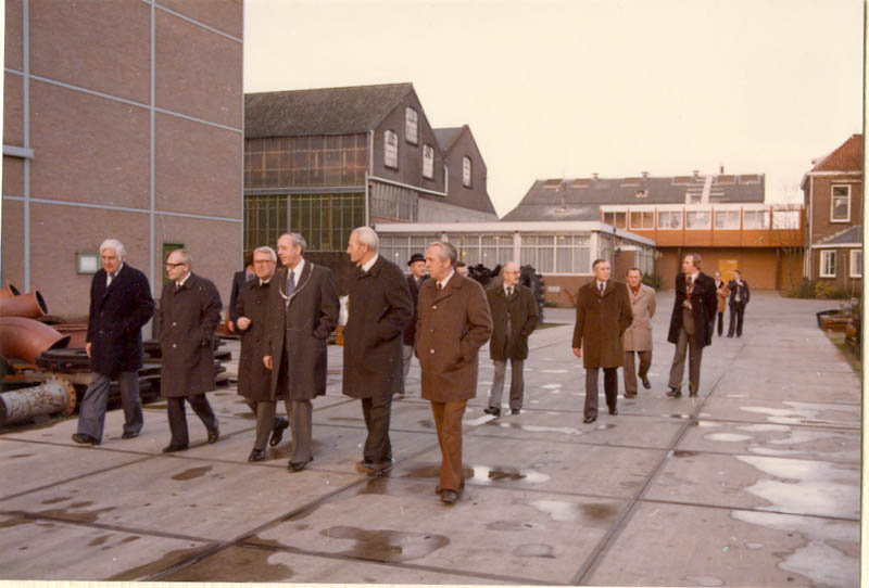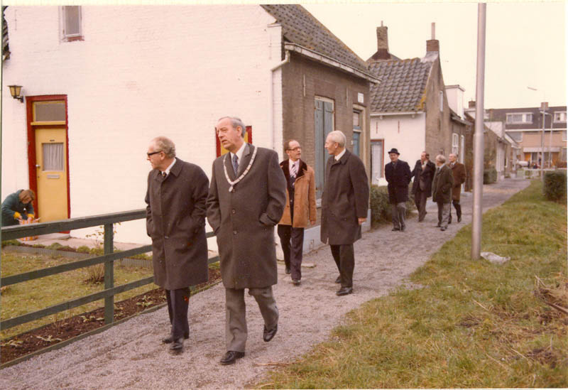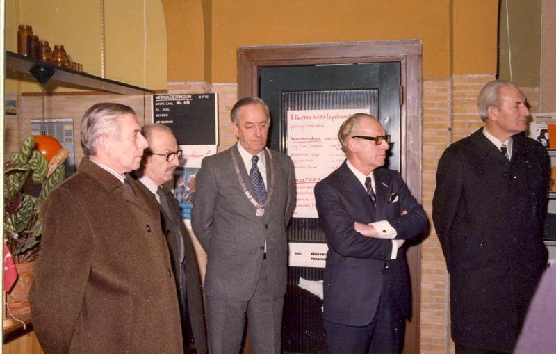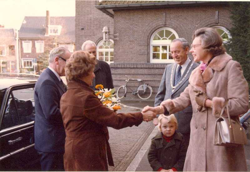 Ontvangst commissaris van de koningin Vrolijk door Jurg de Boon, Rob de Bruijn en burgemeester Hendriks.