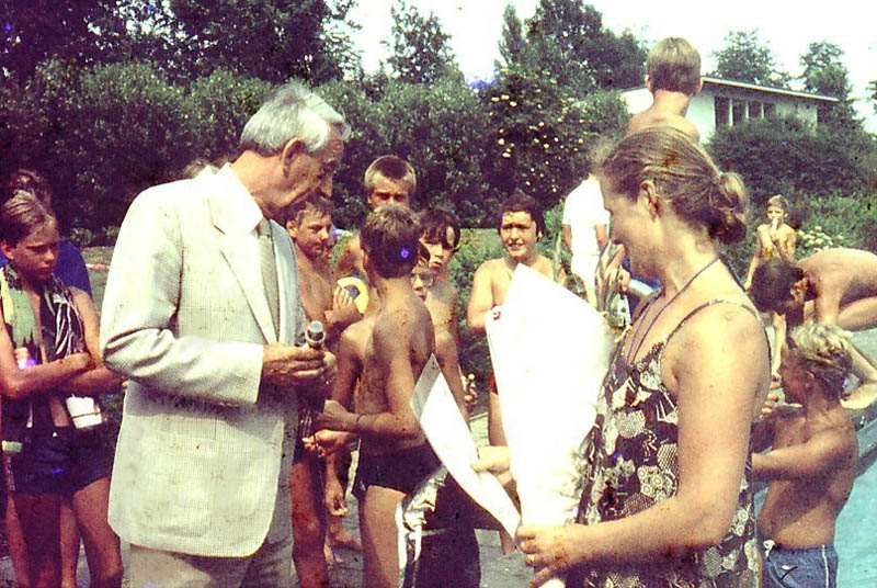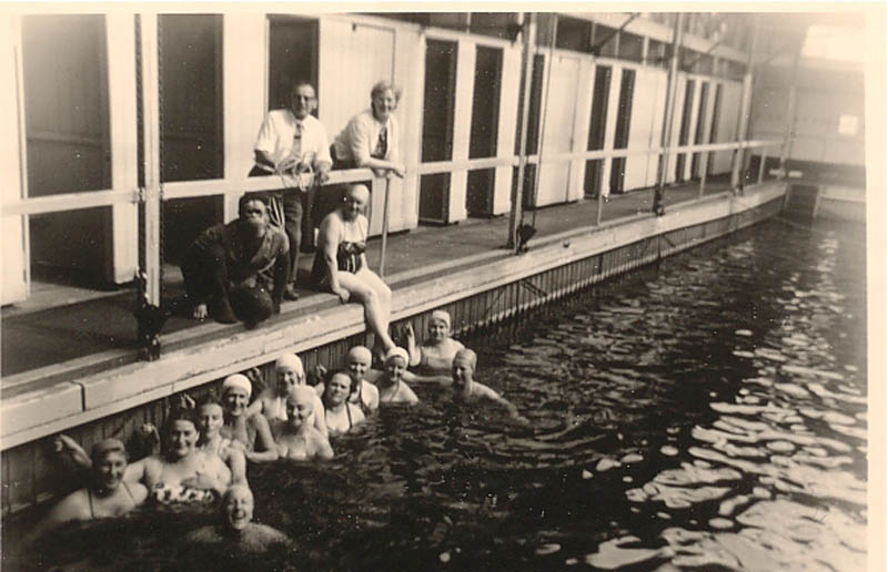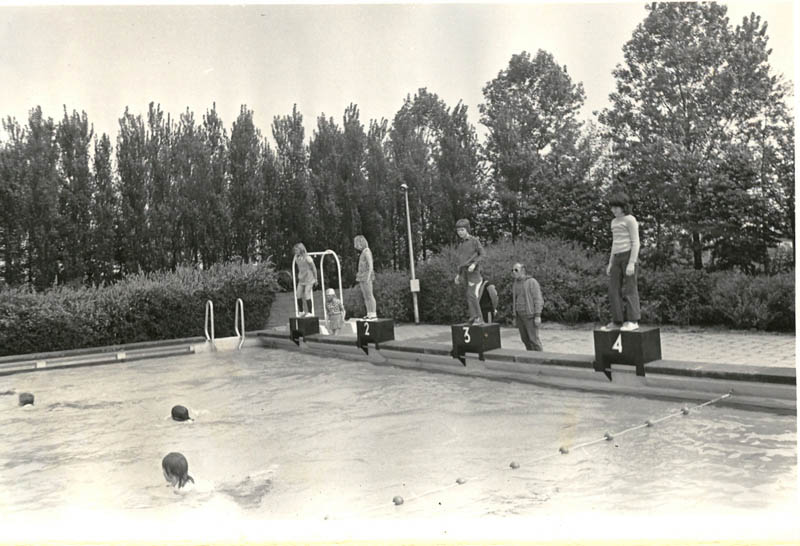 Diplomazwemmen in buitenbad De Lockhorst. In het midden staat Jannes Schreuder.