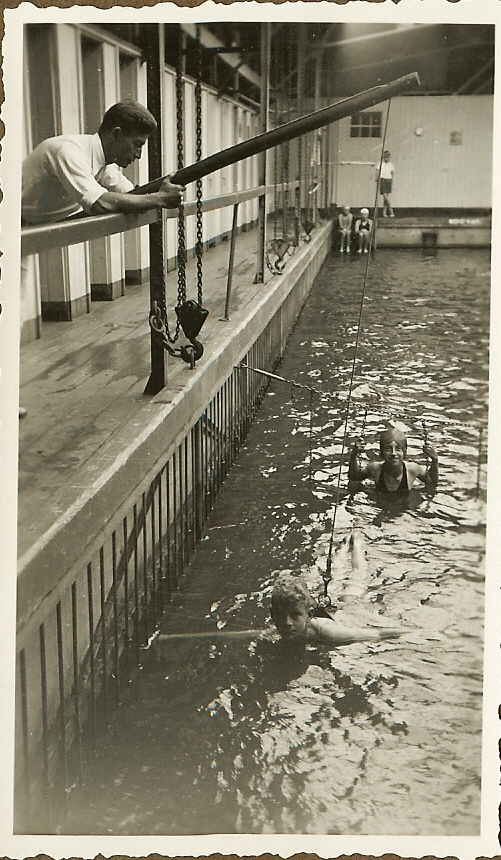 Aan de haak zwemmen leren in het zwembad in de haven in 1936