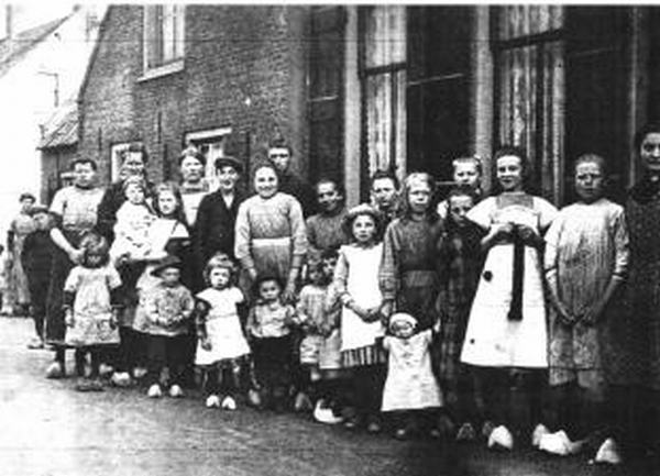 Nabij het veer in wijk A. Mevr. Groeneveld met dochter, Woutrina van der Vlies, Mevr. Van Heumen, Mevr. Van den Berg, Arie Baan, Betsie van Heumen, Agatha Bot met op de arm Diena Stout, Jan Baan, Cornelis Hartog, Marigje van Tilburg,