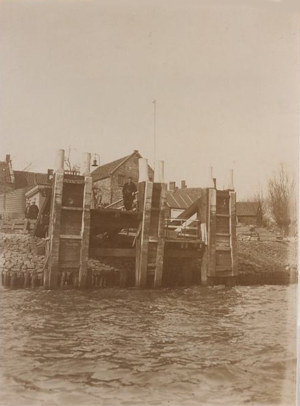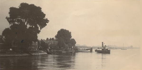 Aanleg Heusdense veer. Veerman Wout Boot.. Aanlegplaats voor de stoomboten. Nabij de huidige synagoge.