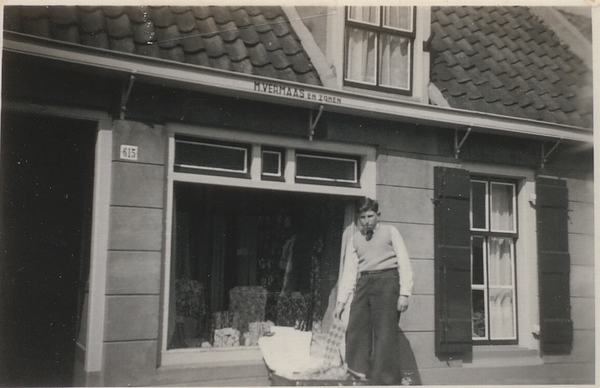 Omgeving vroegere scheepswerf Baars. De winkel van Vermaas textiel. Op de foto Piet Vermaas.