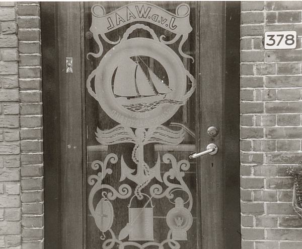 Raam in woondeur van winkel scheepsbenodigdheden Van der Waal. Omgeving De Wiel. Raam bevindt zich nog steeds in de woning!