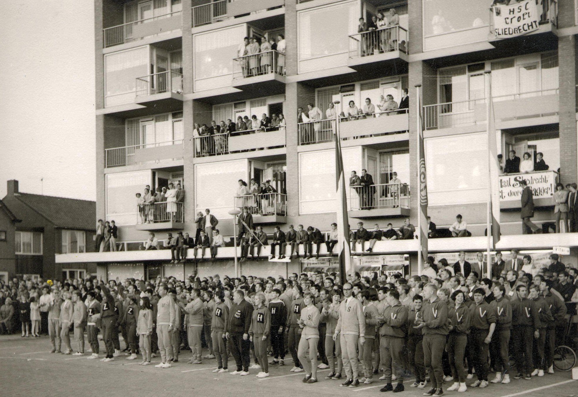 Deelnemers Zeskamp presenteren zich op het Burg. Winklerplein