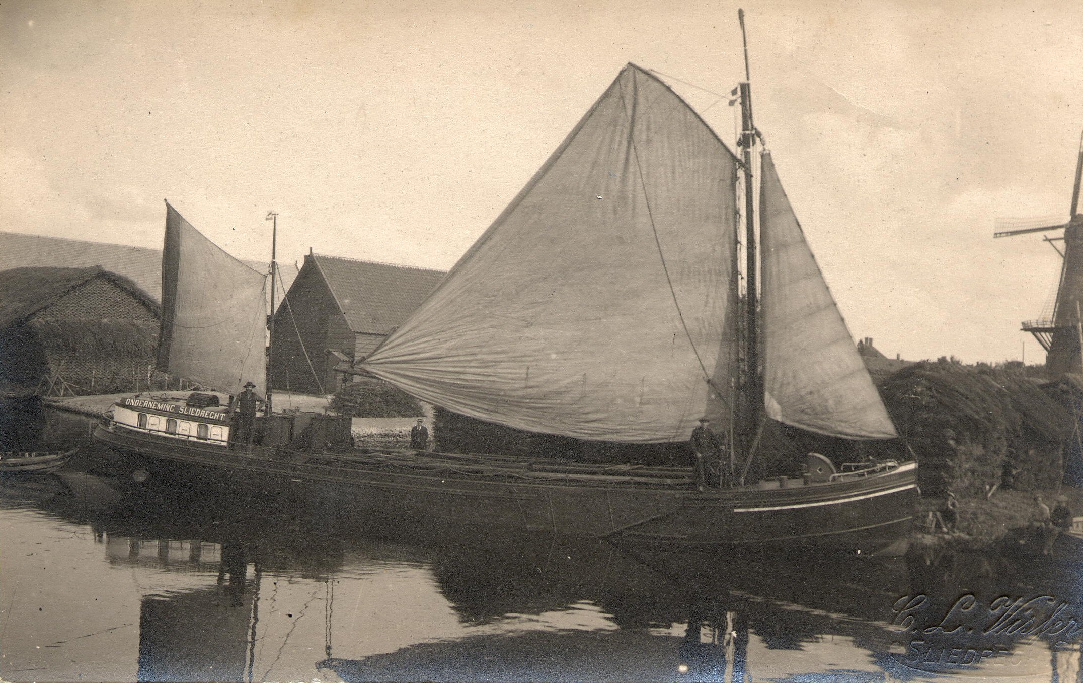 Fotokaart net motorzeilschip 'Onderneming' van A. Bot uit Sliedrecht. Achtergrond molen wijk C. Bij mast schipper Arie Blokland, bij roef Piet Leeuwenstein en op de wal A. Bot. Fotograaf C. L. Visser.