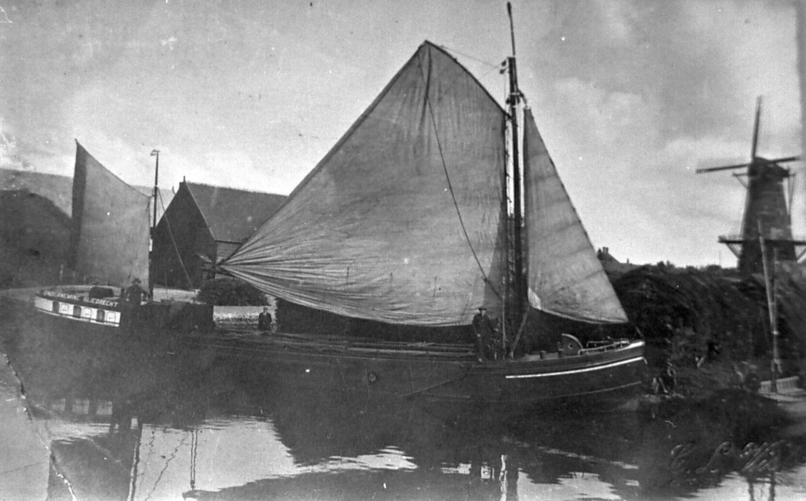 Zeil vrachtschip 'Onderneming' in het kleindiep. Op achtergrond de molen van Wijk C
