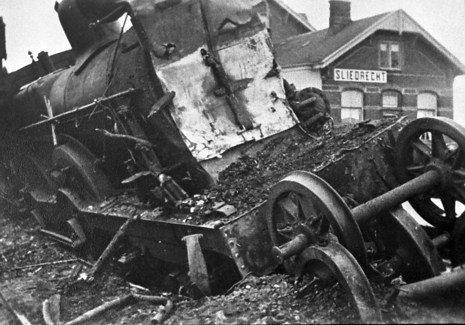 Treinramp station Sliedrecht. 27 november 1942 Sliedrecht. 18 doden en 62 gewonden. Sein A2 werd ten onrechte op veilig gezet waardoor trein 10814 op spoor 2 achterop trein 3168 botste.