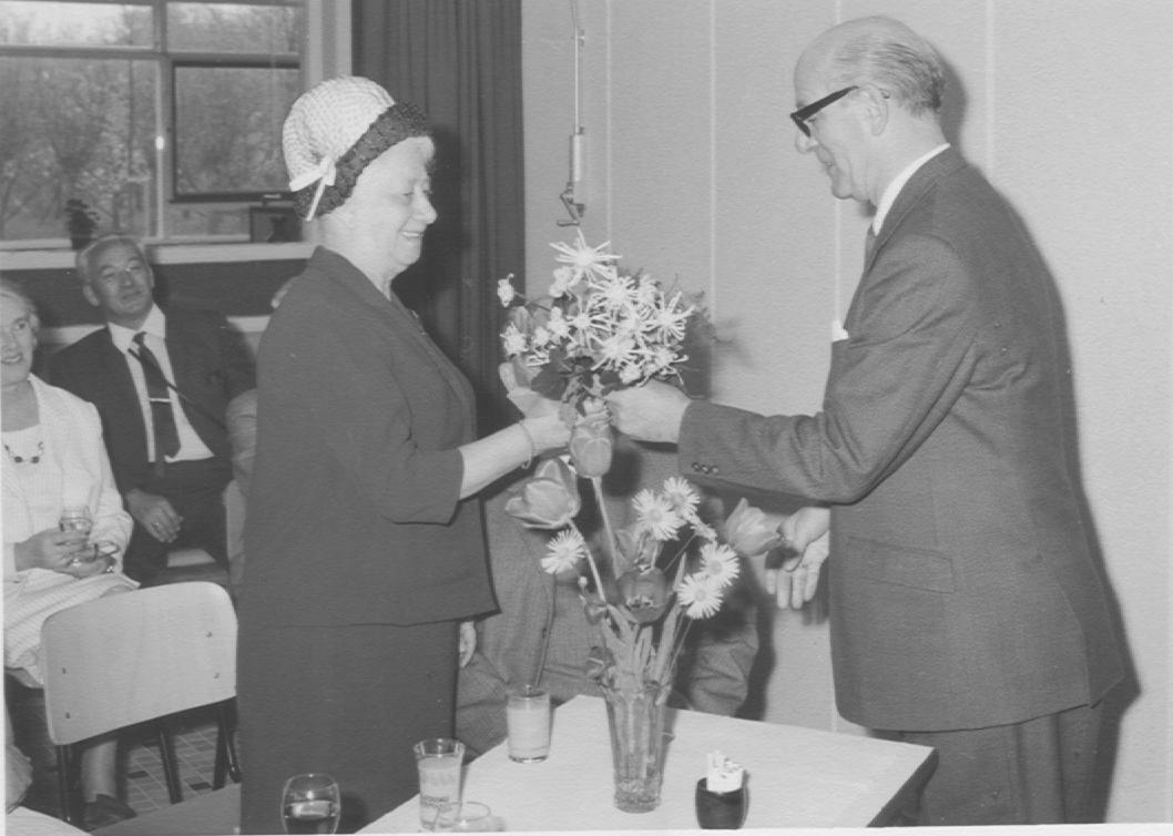 Schoolfoto school 1. Opening Boerhaaveschool 1968. Van Hofwegen biedt mevr. Huisson een bloemetje aan.