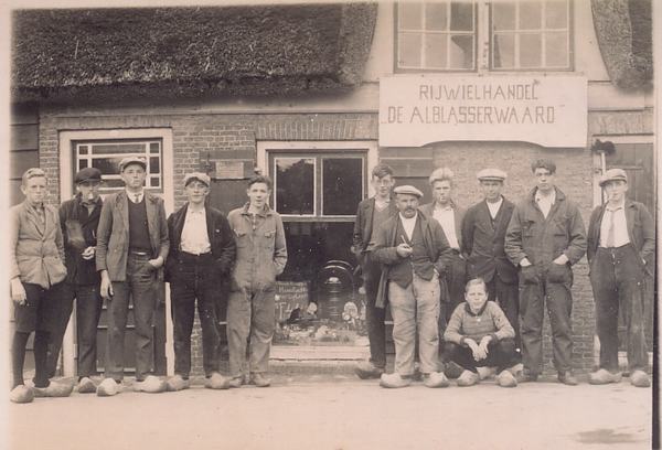 Groep mensen bij de Zaai voor de zaak van Frans Dubbeldam, fietsenmaker. Dubbeldam staat 2e van rechts.
