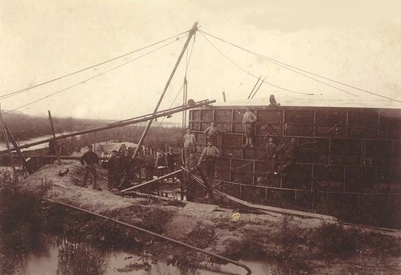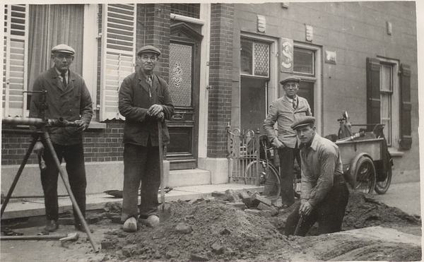 Gasfitters aan het werk in de dijk. Henk van den Berg staat in de put, links Bram Heytink met schop Wim Konijnburg en rechts Huig Harrewijn. Plaats Peulenstraat Hardinxveld.