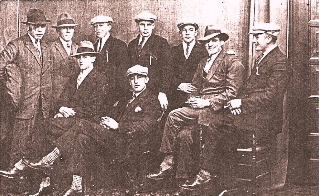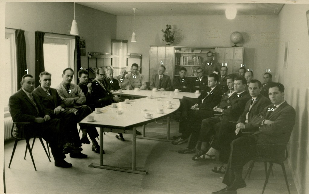 Van links naar rechts: Adriaan Cleton, Joost van den Bos, Aart de Groot, Gerard de Bruin, Krijn Schram?, Piet Kop, Gijs Stoop, Jan Redelijkheid en Jan de Bruin.