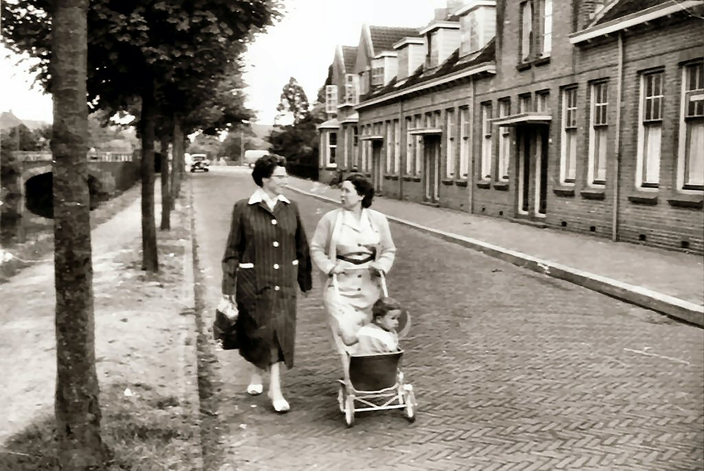 Wandelen in de Wilhelminastraat. Achter de wandelwagen mevrouw Van der Zwaan. Het lieve jongetje Jacky, nu Jacques van de Zwaan.