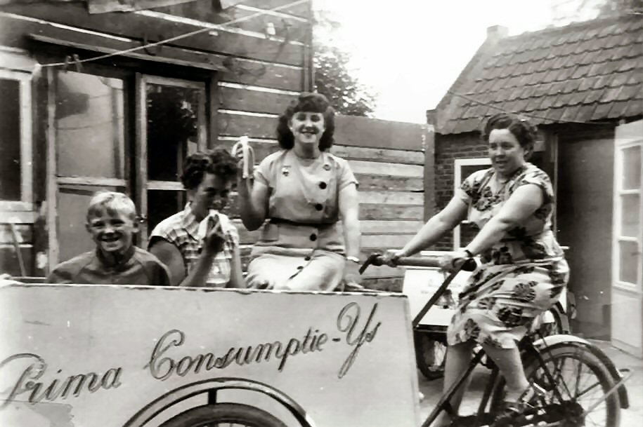 Mevrouw Van der Zwaan aan het stuur. Nicht Trijn en neef Bertus Bakker in de bakfiets. Bertus had later een nogakraam en zijn kinderen staan nog steeds op de kermisssen. Ook in Sliedrecht.