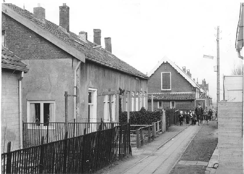 Piet Rijsdijkstoep met kleuterschool.Het gebouwtje achter het gepleisterde gebouw was de Kleuterschool, waar juist kinderen uitkomen.
