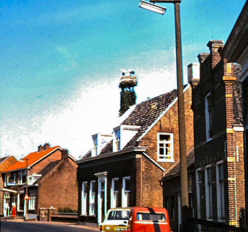 Huis met ooievaarsnest op de schootsteen nabij de vroegere Beatrixschool