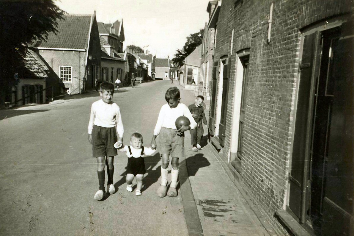 Op de dijk bij de Molenstraat in wijk C. De broertjes Gustaf (links) en Willy Hubner, in het midden Albert v/d Heuvel. Op achtergrond Marius Treffers.