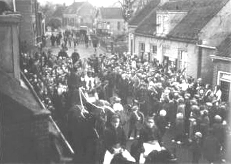 Sint Nicolaasviering bij de Blauwe Pui. Gebouw gesloopt. Op deze plaats staat nu het pand van Schepers, inclusief Het Onderhuys.