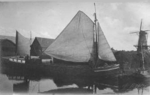 Zeilschip. Op achtegrond de korenmolen in wijk C