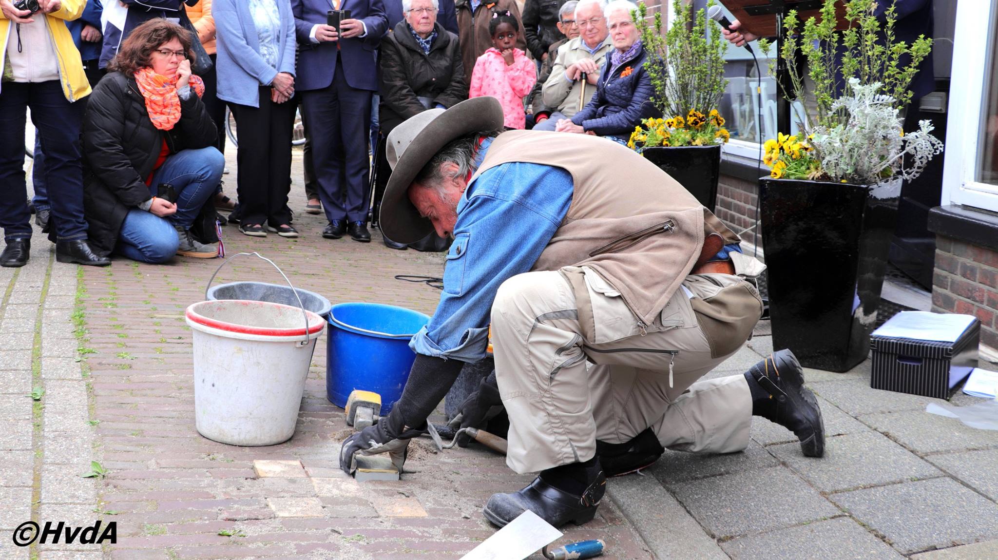 Plaatsen van struikelstenen te Sliedrecht. Foto Hans van der Aa.
