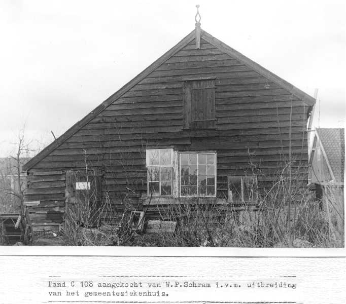 Hoepmakersschuur, gesloopt i.v.m. de bouw gemeenteziekenhuis. In deze oude hoepmakersschuur was de laatste periode eerst aannemer Visser en daarna aannemer Joh. de Vries gevestigd.