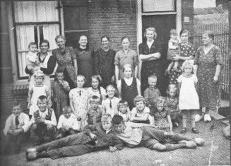 Achter v.l.n.r : Lijntje Kop-Teeuw,Adrie Kop,Aant van der Tak,Lena Kop,Marigje Zwijnenburg, mevr. Zege-laar, mevr.Elshout-Kegel met mijn zusje Marie op haar arm,onbekend. Rij kinderen o.a. Zegelaar. Hurkend:Kors Zegelaar,Otto Elshout, Lies Elshout.