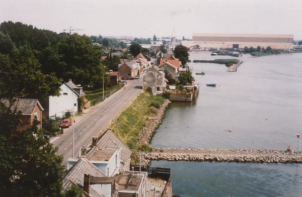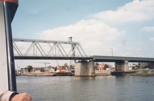 Zicht op Baanhoek en spoorbug vanaf de rivier.
