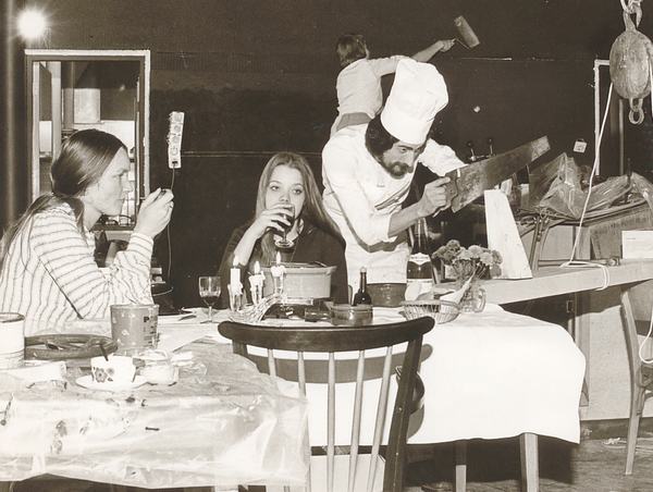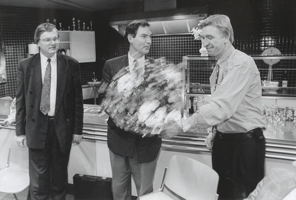 In de bakkerij van bakker Van der Wiel. Nico Vermeulen (midden), Aart van Valen (rechts) en ondergetekende (Gerard Treffers, links op de foto), prijswinnaars bij een bakkerswedstrijd.