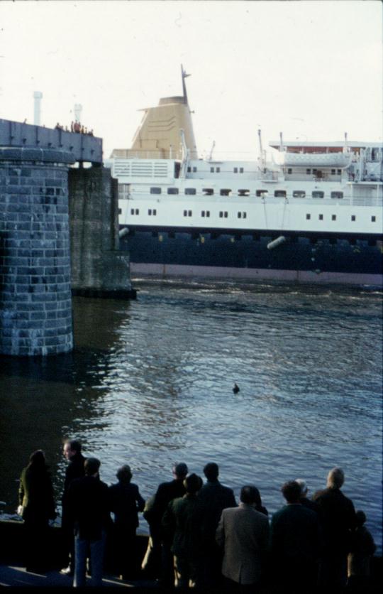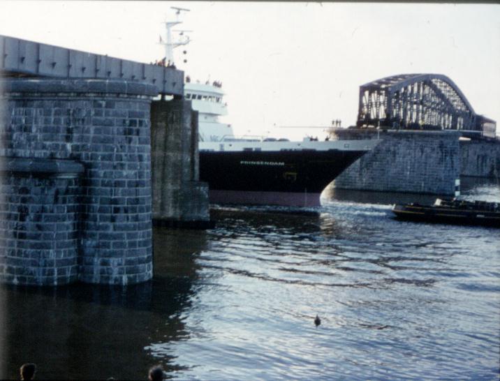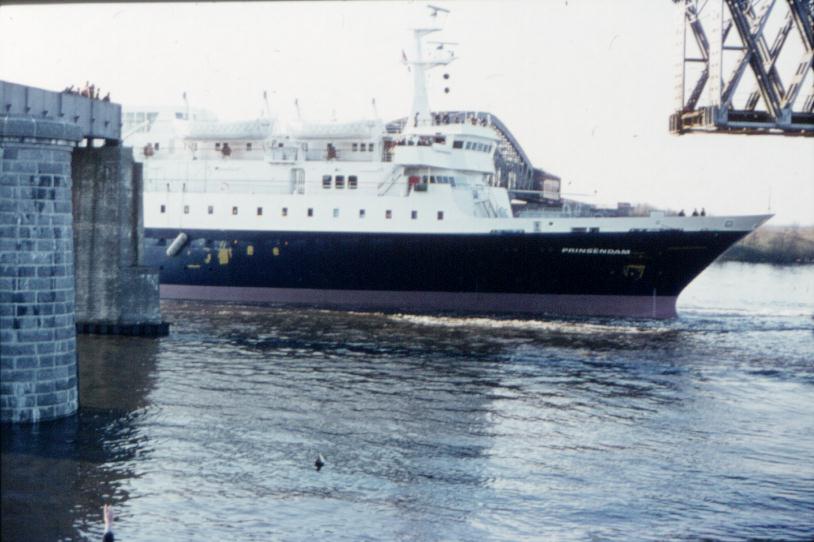 Doorvaren van de Prinsendam bij de Baanhoekbrug