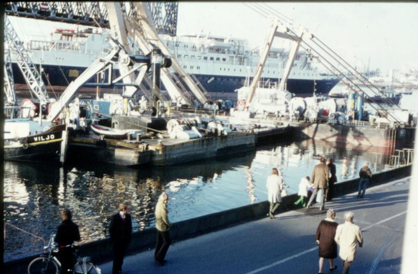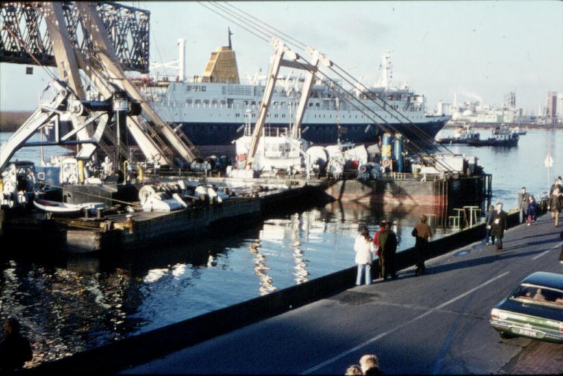 Prinsendam bij de Baanhoekspoorbrug. Prinsendam, gebouwd bij de Merwede te H.veld-G.dam bouwnummer 606. v.r.v. Holland-Amerkalijn.Te waterlating 07-07-1972. Oplevering 12-11-1973.