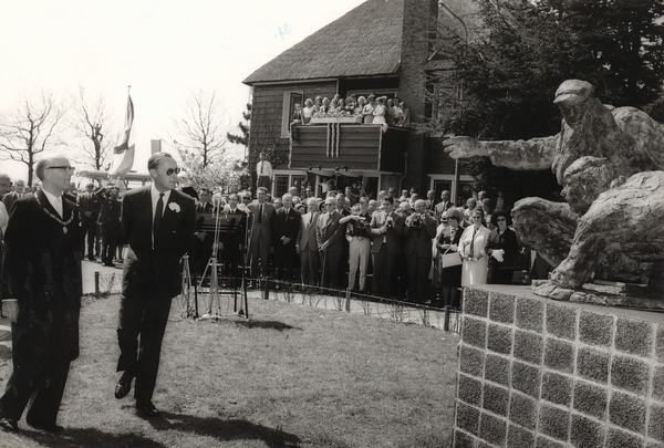 Onthulling monument Albrechtplein met Prins Bernhard en burgemeester Van Hofwegen