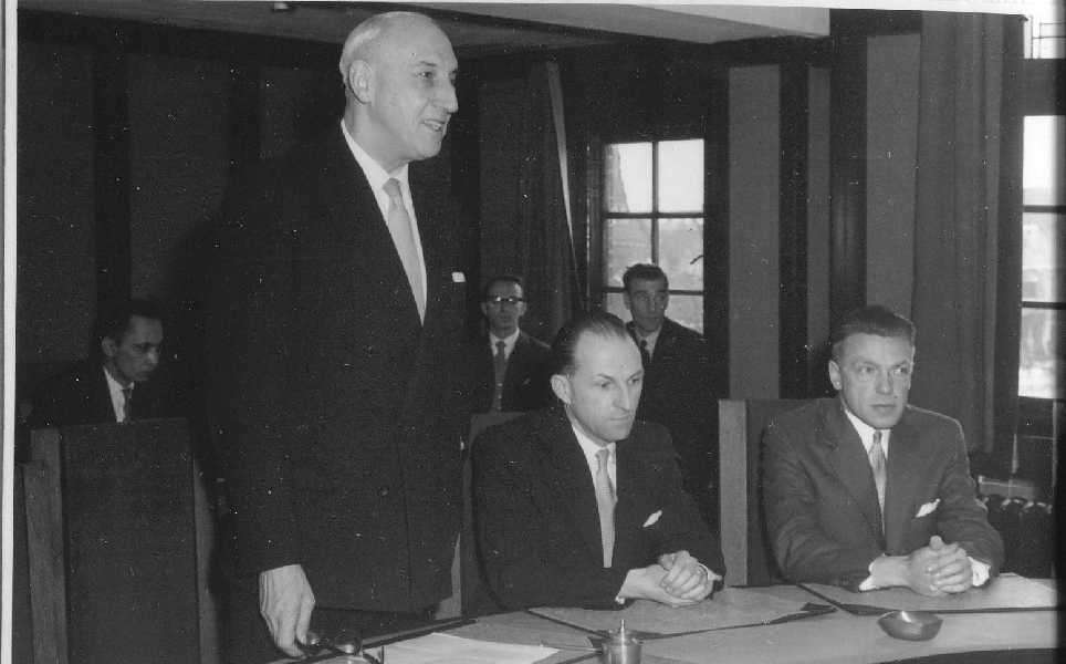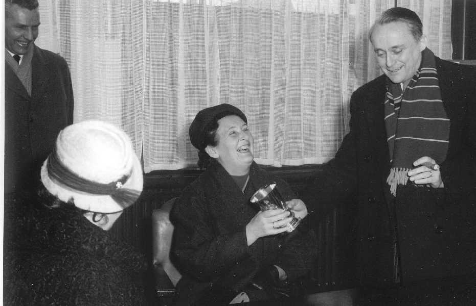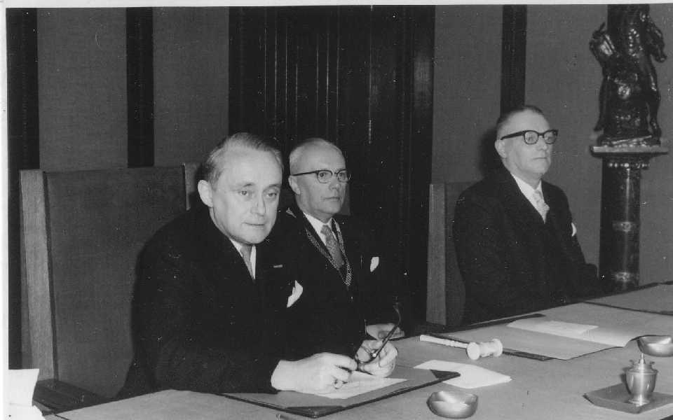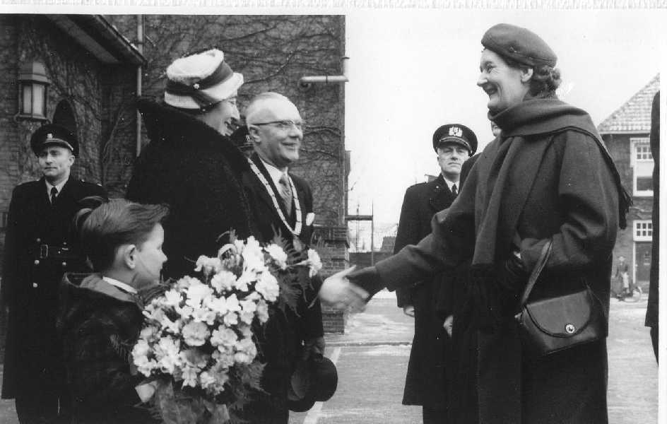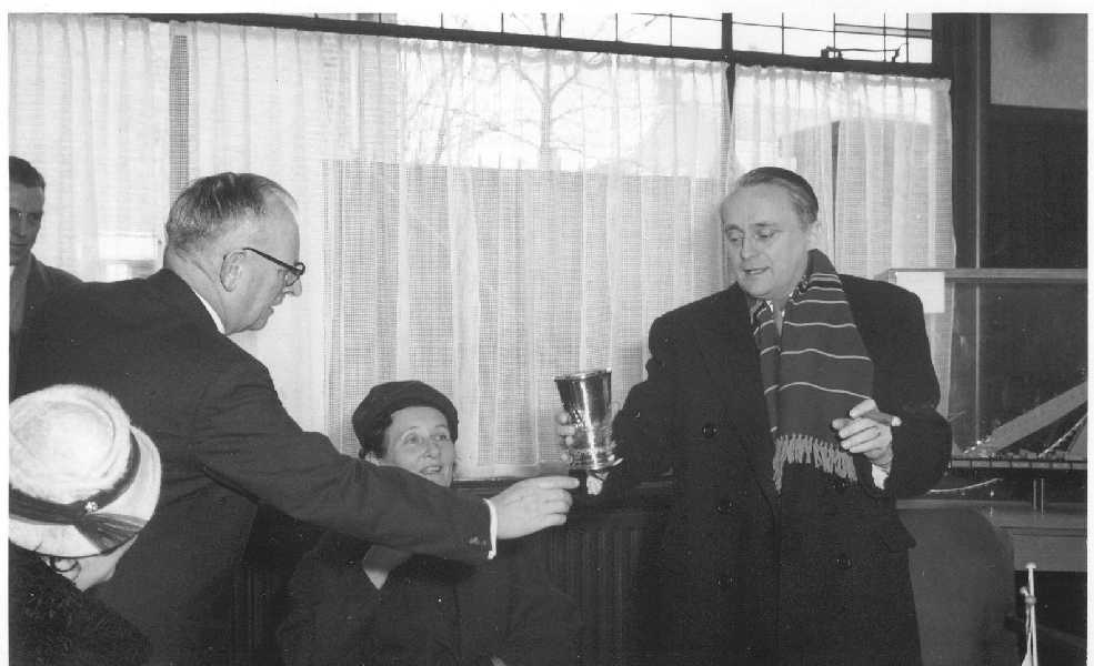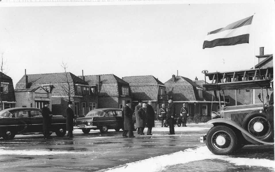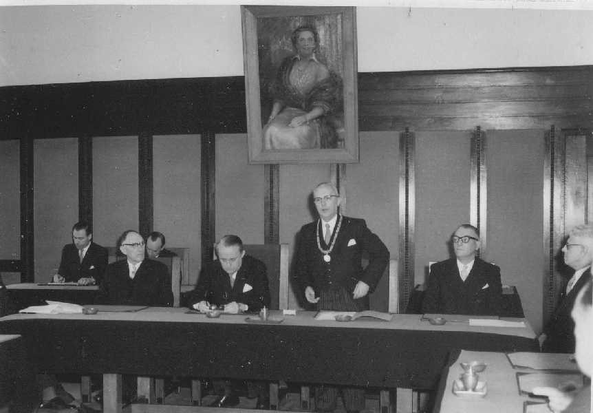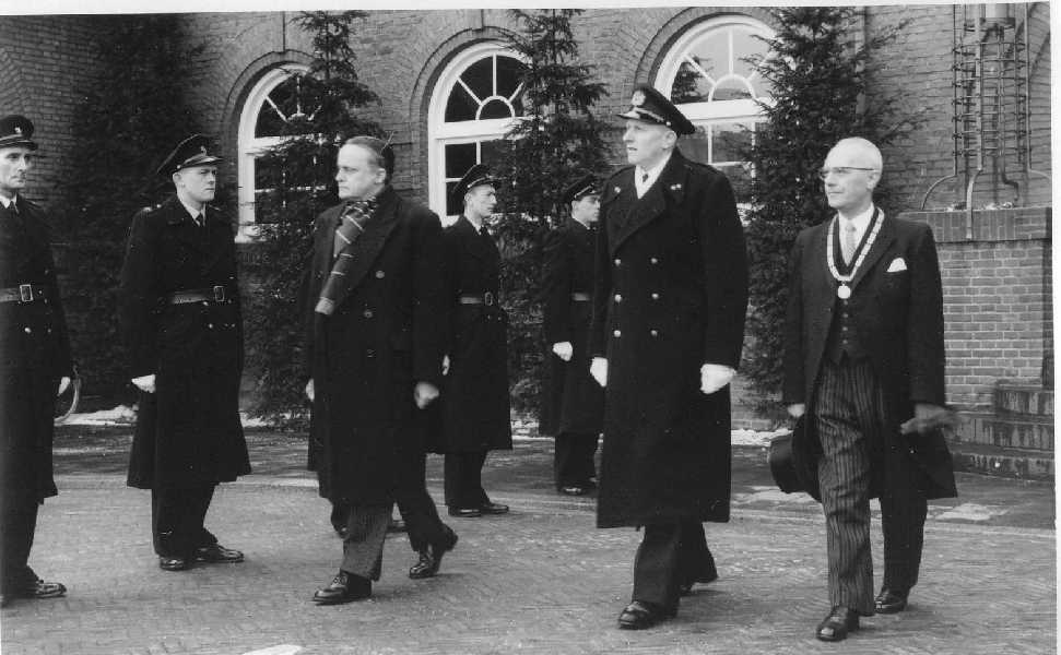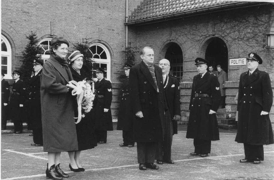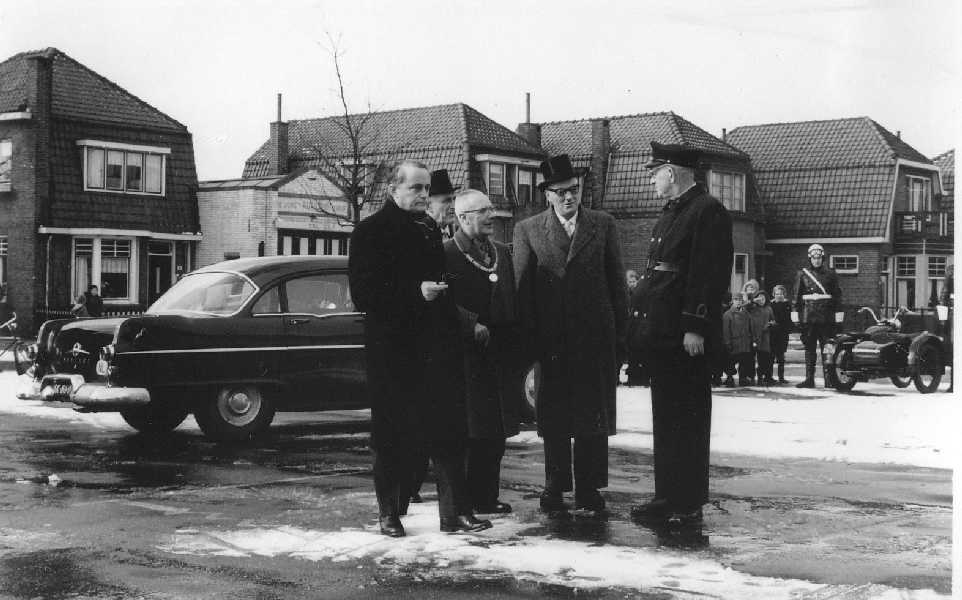 Burgemeester Feitsma neemt afscheid in 1960. Op de achtergrond agent Borsboom.