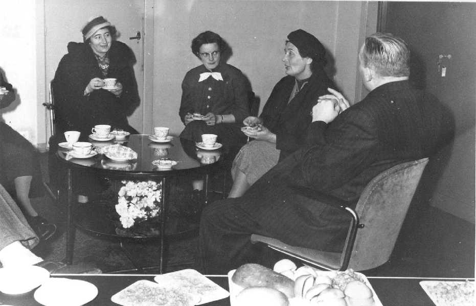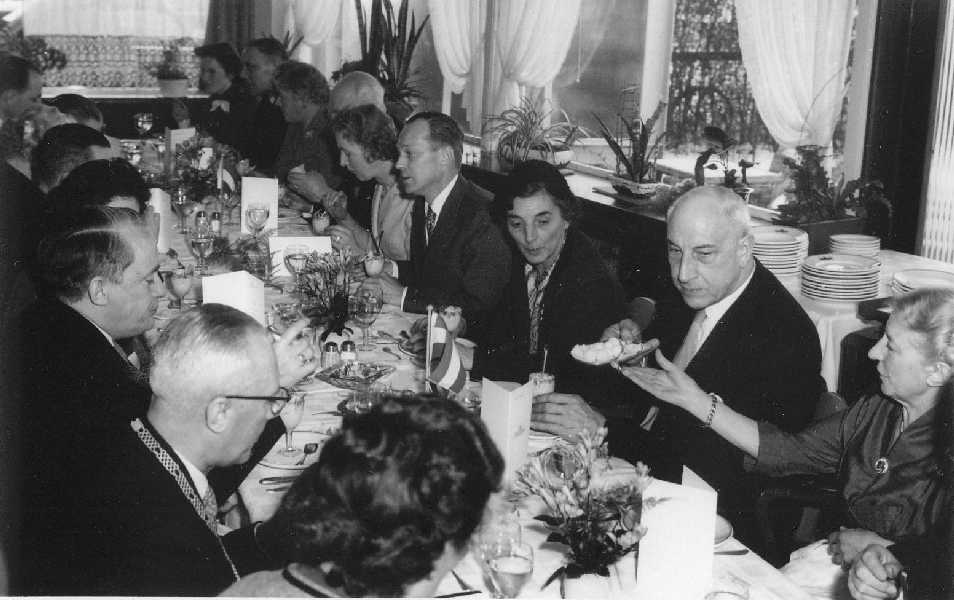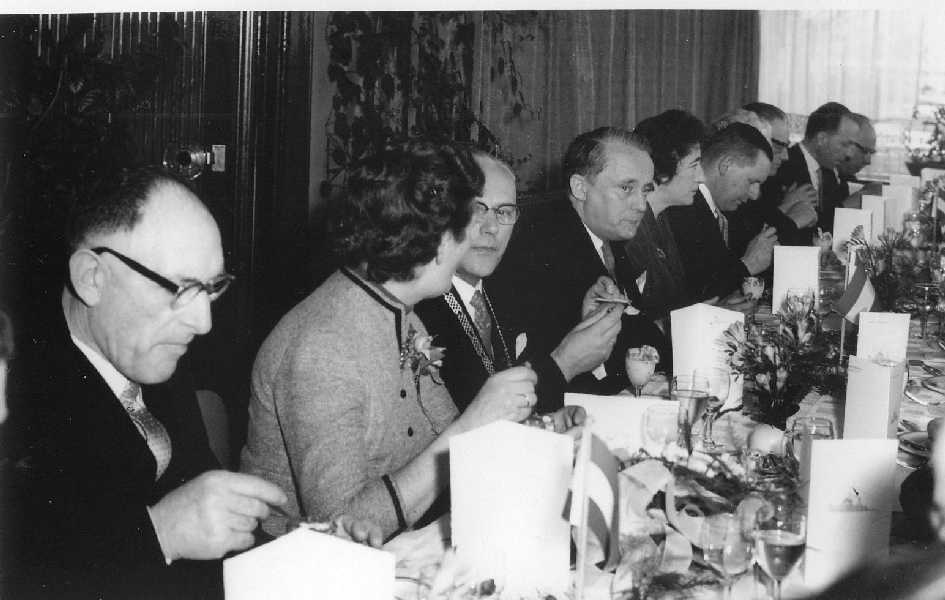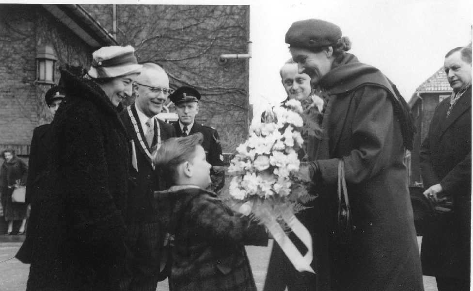 Burgemeester Feitsma neemt afscheid in 1960, hier met kleinzoon van A. Baars. Commissaris v.d Koningin Klaassen met mevrouw Klaassen en het echtpaar Feitsma.