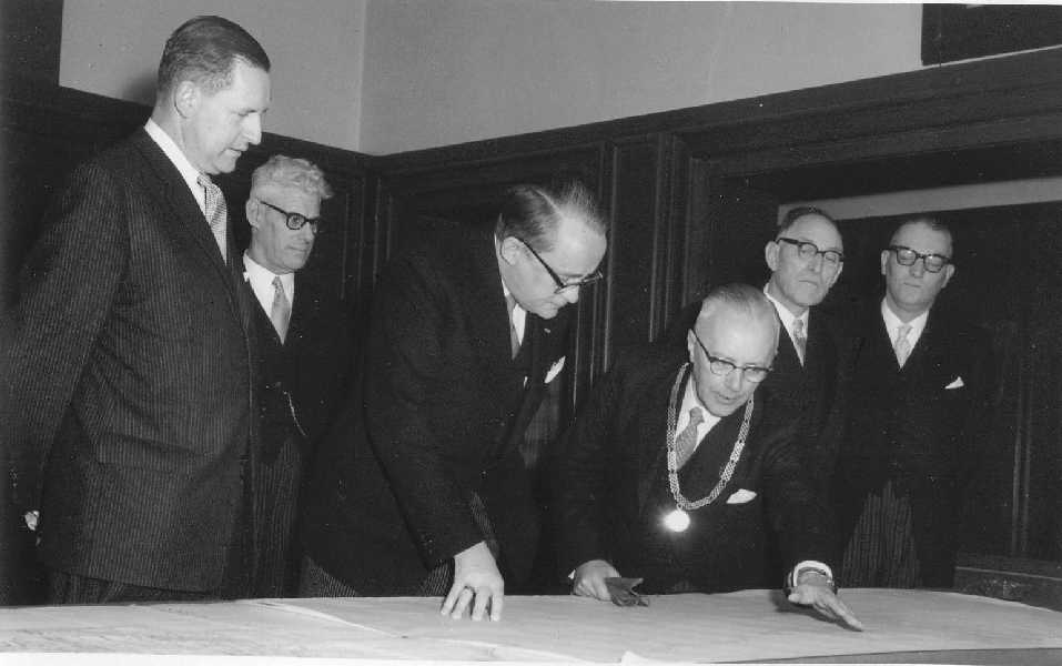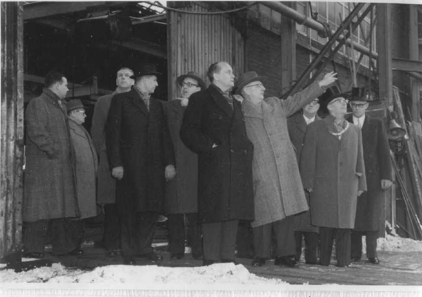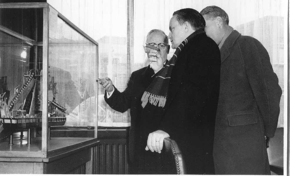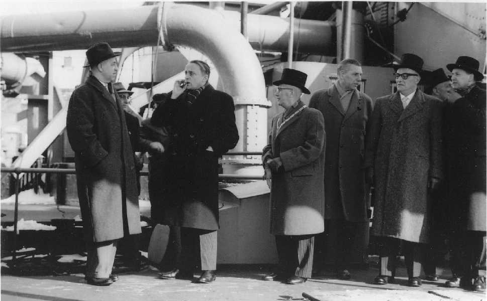 Afscheid burgemeester Feitsma in 1960 met bezoek aan scheepswerf De Klop.Voorgrond van rechts naar links: Gemeentesecretaris Van Noord, burgemeester Feitsma, wethouder Baars en de heer H. van Seventer.
