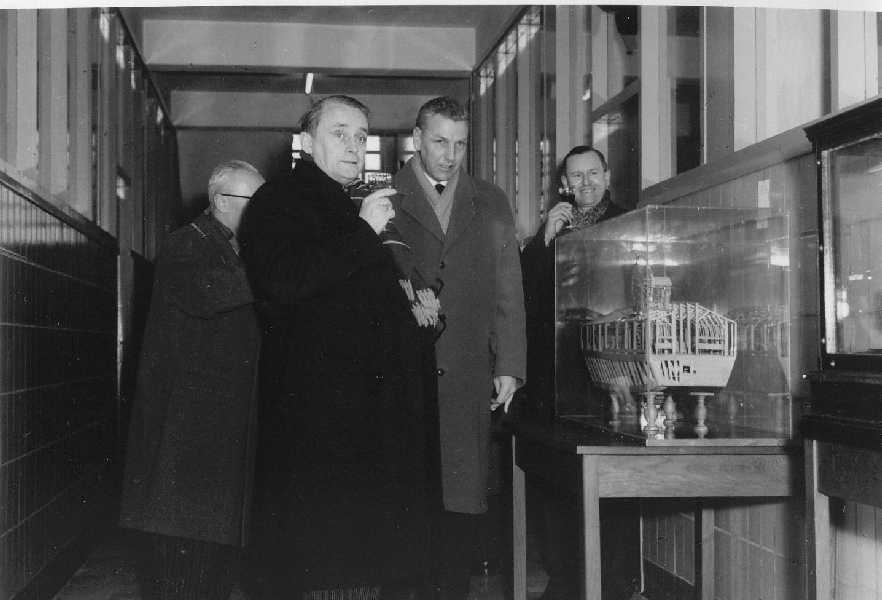 Afscheid burgemeester Feitsma in 1960 tijdens bezoek aan Baggermuseum. Directeur scheepswerf De Klop, de heer Den Ouden en commissaris der Koningin Klaassen.
