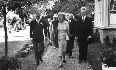 Bezoek 1951 van koningin Juliana en Prins Bernhard. L Prins Bernhard , midden de koningin en R D. van Noord R achter koningin A. G. de Waard, regent van het rusthuis en achter burgemeester Winkler, l achteraan J. D. van der Leun regent.