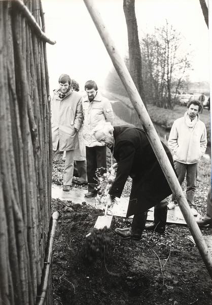 Plaatsen van wilgentakkenscherm langs Rijksweg met burgemeester Hendriks