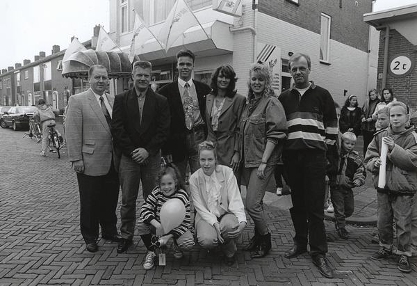 Schaatsenrijder Falco Zandstra op bezoek bij Verschoor in de Chr. Huijgensstraat
