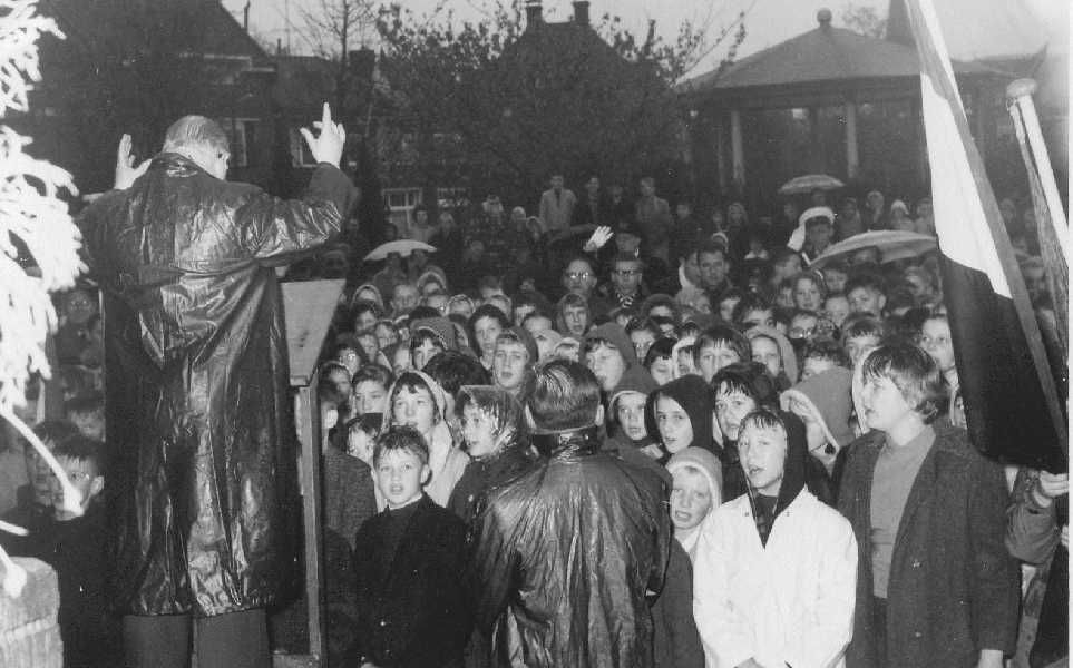Burgemeester wordt toegezongen door schooljeugd o.l.v. de heer Kila