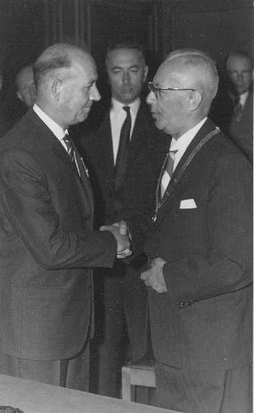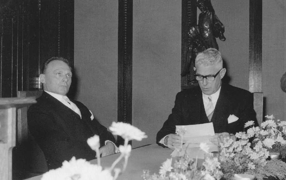 Gemeentesecretaris Van Noord en wethouder Bons tijdens de intrede van Burgemeester Van Hofwegen